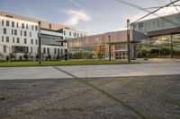 This is an image of a cityscape in Toronto, Canada. The modern architecture of office buildings is prominently displayed across from a basketball court, barely visible through the fencing. The sunny day casts hard shadows on the concrete surfaces of the city. The urban design features open spaces and businesses, creating a bustling business district. The vegetation and grass provide a touch of nature amidst the urban landscape. This photo captures the essence of Toronto's urban architecture and design.