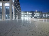 A modern urban plaza in Berlin, Germany. The concrete architecture shines under the artificial lights of the city at night. The open space and clear sky create a captivating atmosphere in Europe's bustling capital.