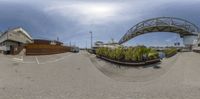 fisheye lens photo of a bridge and a marina with water on one side, houses at the other