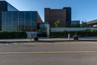 A modern architecture profile in Toronto's business district. Clear sky provides a stunning background for the sleek lines of office buildings and museums. The asphalt road and curbs add a touch of urbanity to the scene.