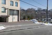a parking garage on the side of a road in front of a building with lots of snow