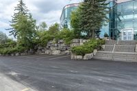 A suburban area in Toronto, Ontario, showcasing modern architecture and residential properties. Streets lined with trees, stone walls and office buildings create a dynamic business district. A blend of nature and infrastructure in Canada's largest city.