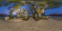 A modern residential neighborhood in Shanghai, China. The night sky is clear, illuminating the purple facade of buildings. Trees and shrubs surround the courtyard, creating a serene atmosphere. Security lighting adds to the ambiance.