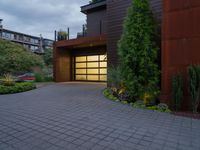 A modern residential villa at dawn, surrounded by lush grass and vegetation. The grey sky adds a gloomy atmosphere to the scene. The architecture features brickwork and large windows, letting in the morning light.