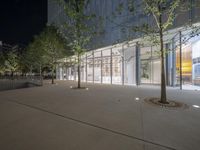 This is an image of a modern office building in China, specifically the business district of Shanghai. The architecture features a combination of concrete, glass, and composite materials. At night, the building is illuminated by artificial light, creating a striking urban design. In front of the building, there are trees that provide shade and add to the overall aesthetic. The darkened sky adds to the ambiance of city life. This photo represents the bustling business environment in Shanghai, a city known for its modern architecture and vibrant urban culture.