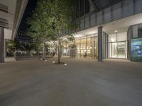 This stock photo showcases a stunning night view of a modern architecture building in the bustling city of Shanghai, China. The building features multiple levels and is made of composite materials such as concrete and steel. In the open space around the building, a solitary tree stands tall, providing shade and adding a touch of nature to the urban landscape. The artificial lights illuminate the columns and road surface, creating a captivating scene that represents urban design and city life in China. The building serves as the headquarters of a prominent business situated in the vibrant business district of Shanghai. The dark sky adds an extra element of mystery and sophistication to the image.