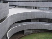 a circular building with concrete steps and an open lawn area beside it by some buildings