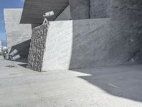 A modern architectural marvel in Tenerife, Spain. The large concrete wall, adorned with a camera, stands in stark contrast to the clear blue sky. People walk by, creating intriguing shadows on the white surface.