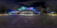 a large modern architecture structure lit up in colors of purple and blue in a circular space with stone walkway