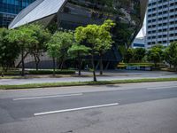 This photo showcases a van parked on the side of a road in Taipei City, Taiwan. Tall buildings and trees surround the van, creating a bustling urban environment. The clear sky overhead adds a touch of serenity to the scene. The futuristic architecture and modern design of the buildings reflect the city's vibrant and forward-thinking atmosphere. The road surface, lined with asphalt and curbs, leads the viewer's gaze towards the van. The abundance of vegetation, including trees and other forms of greenery, provides shade and enhances the overall urban design. This image captures the essence of city life in Taipei, a city known for its blend of tradition and modernity.