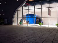 some people walking in a building near a large glass window at night by some pots