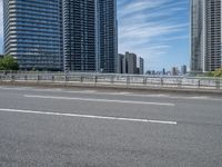 Modern architecture in Tokyo, Japan. Daytime cityscape with a blend of urban skyline and bridges. Clouds hover over the city, reflecting on the sleek asphalt roads with Armco barriers.