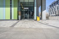 A yellow object sitting on the sidewalk next to the entrance to a large office building in the vibrant city of Toronto, Ontario, Canada. The modern architecture, with its glass walls and composite material facade, stands out against the clear blue sky. The urban design incorporates a green wall and a public space with asphalt road and parking. The large windows and glass walls provide a bright and inviting atmosphere inside the building, while the concrete surface and green curb add to the dynamic city life.