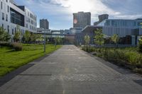 This is a view of a modern architecture office building in Toronto, Canada. The high-rise building stands tall in the business district, surrounded by other buildings. The surface of the road is visible, covered in asphalt. The grass and vegetation add a touch of greenery to the urban design. The clear blue sky with fluffy clouds and the bright sunshine create a sunny day atmosphere. This photo showcases the architecture and urban landscape of Toronto, depicting the bustling business district and the straight road leading to the office building.