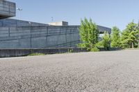 a cement structure behind some trees near a building wall and sidewalk of a parking lot