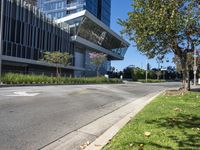 An empty road in the heart of Downtown Los Angeles, surrounded by modern architecture. Clear skies cast a beautiful light on the urban landscape. A perfect day to explore the city's vibrant business district and cultural treasures.