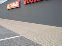 This is a photo of a modern building in an urban area in Germany, Europe. The grey rectangular building with a red and yellow sign on the side is a store front. The clean and precise urban design of the building reflects the modern architecture commonly found in European cities. The surrounding public space features asphalt road surfaces and lined markings. In the distance, there is an industrial warehouse, representing the industrial nature of the area. This image captures a typical day in a bustling European city, showcasing the fusion of urban design and industrialization.