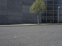 This photo captures the corner of an empty street near a high rise building in Berlin, Germany. The modern architecture of the building stands out against the urban landscape. The road, made of asphalt, is lined with green grass and trees, creating a peaceful atmosphere in the midst of the busy city life. The photo represents the vibrant and dynamic nature of urban design in Europe, particularly in the business district of Berlin.