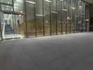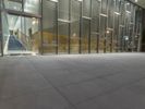 Inside view of an architecturally stunning auditorium with circular glass walls, illuminated by artificial light. The elevated walkway adds a unique perspective. A modern masterpiece of design and structure.