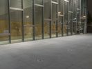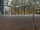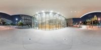 a fish eye lens shows the inside of an auditorium building with circular glass walls and an elevated walkway