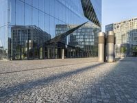 This stunning stock photo showcases the modern architecture of Berlin, Germany. The image features a beautiful mix of buildings reflected in glass, with two metal pillars standing tall on a brick ground in front of them. The reflection of other buildings adds depth and urban charm to the scene. The city's open spaces and cobblestone streets create a perfect blend of old-world charm and contemporary design. The clear blue sky and lush trees in the background accentuate the beauty of this metropolitan area. This image captures the essence of Berlin's vibrant city life and its thriving business district. It is an ideal visual representation of urban design and modernity in Europe.