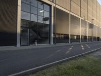 This stock photo captures the modern architecture of Berlin, Germany during the break of day. The city comes alive as the dawn sky illuminates the urban landscape. The image features a road with asphalt leading to a mixed-use corporate headquarters building. The facade of the building is made of glass and includes lines and windows, showcasing a minimalist and Brutalist architectural design. In the background, you can see a warehouse and an office building, representing the bustling business district of the city. The metal walls and glass walls add a touch of sophistication to the urban design. This image perfectly represents the dynamic city life and the forward-thinking business scene of Berlin, a major city in Europe.