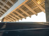 A modern building in Barcelona with a symmetrical facade and composite material. The urban design reflects the city's architecture. Hard shadows create a dramatic effect under a clear sky. Sunrise over the coastal landscape of Spain.
