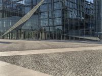 A modern building in the city streets of Berlin, Germany. The large building has a sleek facade with glass walls and metal surfaces. It is surrounded by open spaces and green vegetation. The building reflects the clear sky and showcases the urban design of the city. A man on a skateboard is leaning against the building, adding to the vibrant city life. The cobblestone streets and tree-lined plaza add to the charm of the European city. The building is an office building located in the business district, showcasing the modern architecture and concrete material property of the urban landscape.