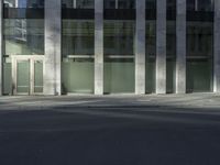 A modern office building in Berlin, Germany, showcasing the city's urban design and architecture. The glass walls reflect the surrounding trees and provide a sleek facade. The concrete columns and hard shadows add to the contemporary vibe of this bustling business district in Europe.
