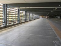 the inside walkway of an empty building with the doors open and the parking spaces empty