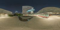 an outdoor seating area at night in front of a modern building with curved columns and concrete roof