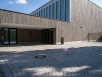The entrance of a modern building in Germany features a brick walkway and a parking area below. The clear sky highlights the sleek design and urban architecture of the villa. A perfect urban open space in Deutschland.