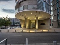 This photo showcases the entrance to a stunning modern building in Hamburg, Germany. The building stands tall in the city's metropolitan area and features a mix of residential and commercial spaces. The facade of the building follows a unique modern architecture design, with a touch of Brutalist elements. The entrance is accompanied by a sidewalk with columns and parking spaces. The image captures the beauty of urban design and structural elements. Hamburg, located in Europe, is known for its impressive architecture and HafenCity district.