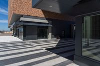 This stock photo features a modern building entrance in Toronto, Ontario, Canada. The entrance is bathed in bright sunlight, with clear blue skies and fluffy clouds in the background. A hard shadow is cast on the surface, adding depth to the scene. The building is located in a suburban residential area, making it a perfect representation of suburban living in Toronto. The house is a beautiful example of contemporary architecture, inviting residents to their home.