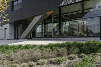 A modern, black-clad building in the heart of Toronto's financial district. The sleek glass front is complemented by lush green bushes, adding a touch of nature amidst the urban landscape.