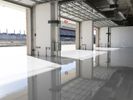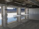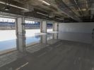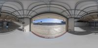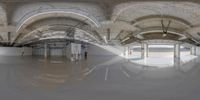 A unique perspective of the interior of a modern building captured by a virtual camera. The architectural structure features glass windows, concrete flooring, and a panoramic view. The space is versatile for apartment living or commercial use.