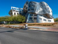 modern building in the desert with concrete and aluminum in front of it on a blue sky day