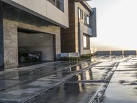 This stock photo features a modern residential building located in the vibrant city of Los Angeles, California, USA. The image depicts a long driveway with a few cars and a bike parked under the building in the rain. The low rain clouds in the sky create a peaceful ambiance. The modern architecture and sleek facade of the building make it an attractive property in a prime location. The wet surface adds to the overall aesthetic of the scene. This image can be used to illustrate concepts related to architecture, real estate, residential areas, and urban living.