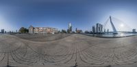 A fish-eye lens captures a modern building with skyscrapers in the background, reflecting in the water below. The urban landscape of Holland comes alive with the clear sky and city lights at night.