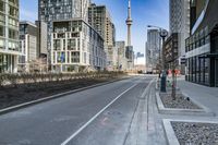 This stock photo features a modern architecture building on a clear day in Toronto, Canada. The tall skyscraper with windows reflects the clear sky. The surrounding street is paved with asphalt and is lined with city lights. In the foreground, there are trees with autumn leaves. The image showcases the urban design and vibrant city life of Toronto, Ontario.