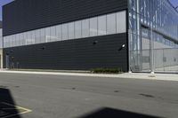 A modern black building with many windows and small round holes on each side. The building stands in a suburban area of Toronto, surrounded by open space. The clear sky casts hard shadows on the grey facade.