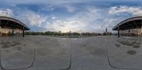two 360 - spherical pictures of buildings and people walking in front of them under a cloudy sky