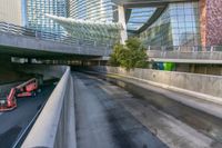 A modern business district in Las Vegas, USA. Futuristic architecture and urban design are showcased in the city's office buildings, roads, and bridges. View of the city life during the day.