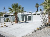 This stunning modern villa, located in the heart of California's Sonora Desert, is surrounded by palm trees and desert rocks and gravel. The paved driveway leading to the house adds to the luxurious aesthetic of this residential property. With its sleek and sophisticated architecture, this home is a perfect blend of contemporary design and natural surroundings. The clear sky above creates a serene and peaceful atmosphere, making it an ideal place to call home. The spacious parking garage and parking lot provide ample space for vehicles. Experience the charm of Palm Springs in this mid-century inspired residence, which offers the perfect combination of style and comfort.