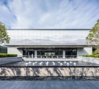 a modern building with water features and large square tiles surrounding the fountain in front of it