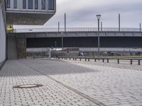 A view of a modern architecture underpass in Berlin, Germany. The city's urban design showcases a blend of composite material flooring and cobblestone streets. The bridge leads to a jetty with a stunning view of the city's skyline.