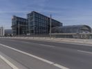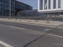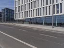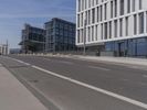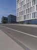 A 360-view of a modern city in Berlin, Germany. The clear sky and empty streets highlight the sleek architecture and corporate headquarters. The urban design and infrastructure create a dynamic cityscape.