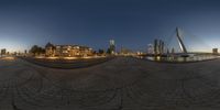 A circular panorama of a modern city in the Netherlands. The cityscape is illuminated by artificial light, creating a vibrant atmosphere. The skyline is dominated by high-rise buildings and cable-stayed bridges. The city is surrounded by water, with sailboats dotting the lake. A unique perspective on urban life in Europe.