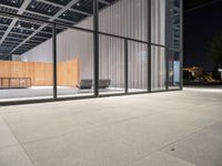 A stunning night view of a city street in Berlin, Germany. The photo captures a modern building with a glass facade, illuminated by artificial light. The room features a stylish design with windows and a fence. The asphalt road surface, lined with pavers, adds to the urban aesthetic. This contemporary urban design showcases the city's architectural beauty and bustling city life. Perfect for showcasing urban, business, and financial districts, as well as modern architecture and cultural sites like museums and galleries.