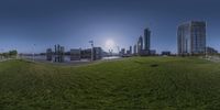 Panoramic view of a modern city skyline with high-rise buildings and skyscrapers. The city is nestled along a coastal harbor, with a river running through lush green grass. The clear sky and sunlight create a vibrant atmosphere.
